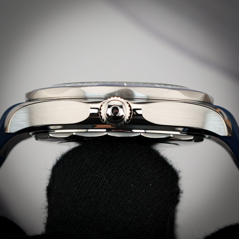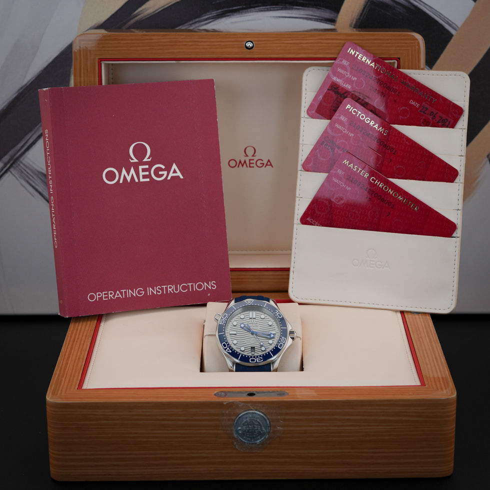 Finished on a blue rubber strap with a stainless steel buckle, this Seamaster Diver 300M balances professional dive capability with everyday wearability, making it a versatile option for daily use, travel, or collection rotation.